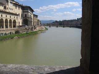 We sort of drifted off to the right and got lost for a moment but using our trusty map we got back on track and made it to the train station (though Deeanna almost ended up in jail for taking a picture of the police lady). After arriving at the station Deeanna realized that she forgot her train ticket back in the room so we changed plans midstream and decided to walk the water front to the Ponte Vecchio bridge (the famous bridge with jewelry stores on it)